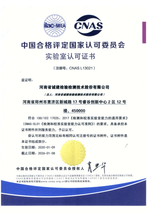 河南省诚建检验检测技术股份有限公司实验室认可证书